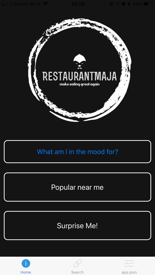 Restaurant Maja is a React Native powered mobile application hosted through expo that helps users choose what they are in the move for by scrolling through a data.json powered listed of pics. Once the user selects a food that they would like to eat, the application extracts the users GPS location and pulls up the nearest restaurants that sell that food via Google Maps.